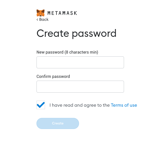 4. Before creating a wallet, we need to secure MetaMask with a password. Coose one that is more than 8 characters long. For more info on Metamask & passwords, read this help article