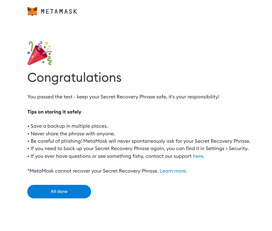 Congratulations! You're now on the path to self sovereignty, financial freedom & a whole universe of dApps; Your wallet can not only be used to store your assets but it will also become your Web3 login & identity across multitude different applications in Web3.