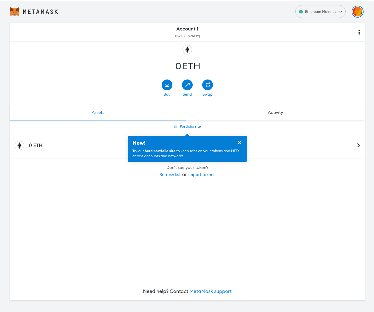 3. Hit 'Continue' and you'll see the main MetaMask screen. This gives an overview of your 'account' or wallet.