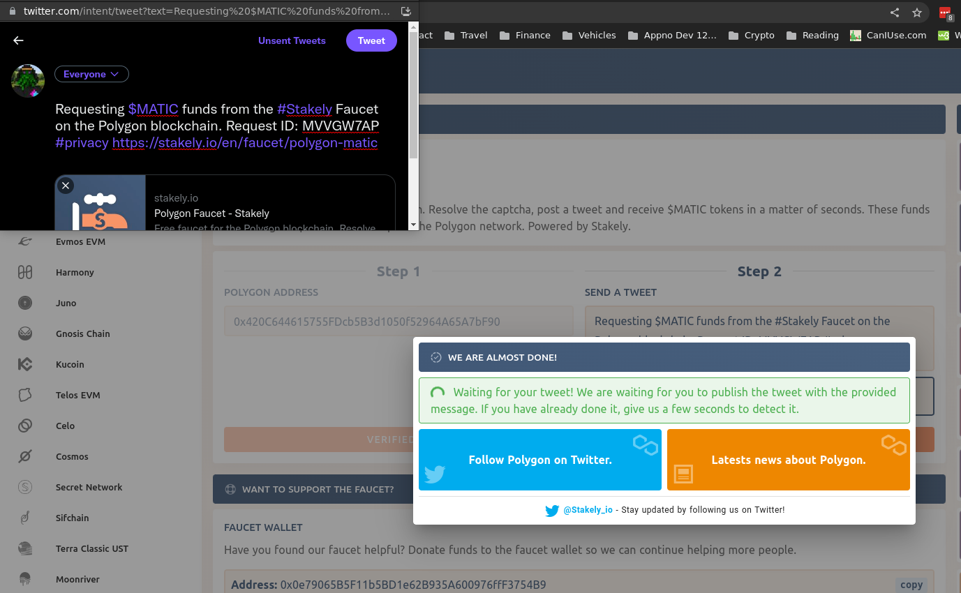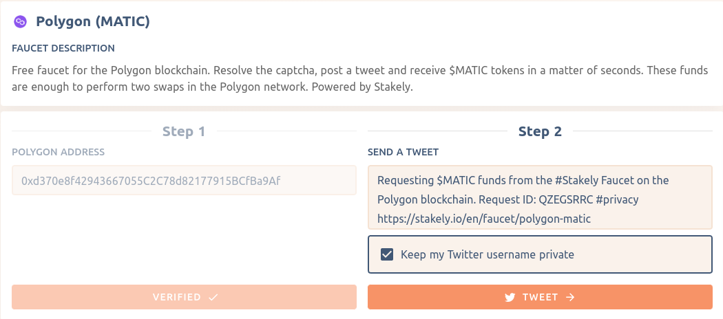5. Once you've made your tweet, the faucet verifies your tweet and in a few moments, check your MetaMask account and you'll see your MATIC balance update.